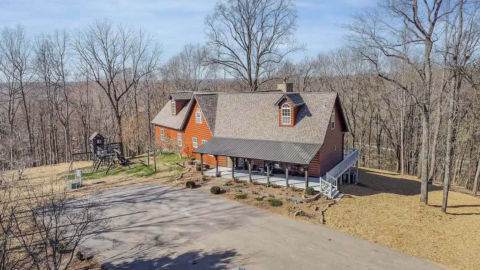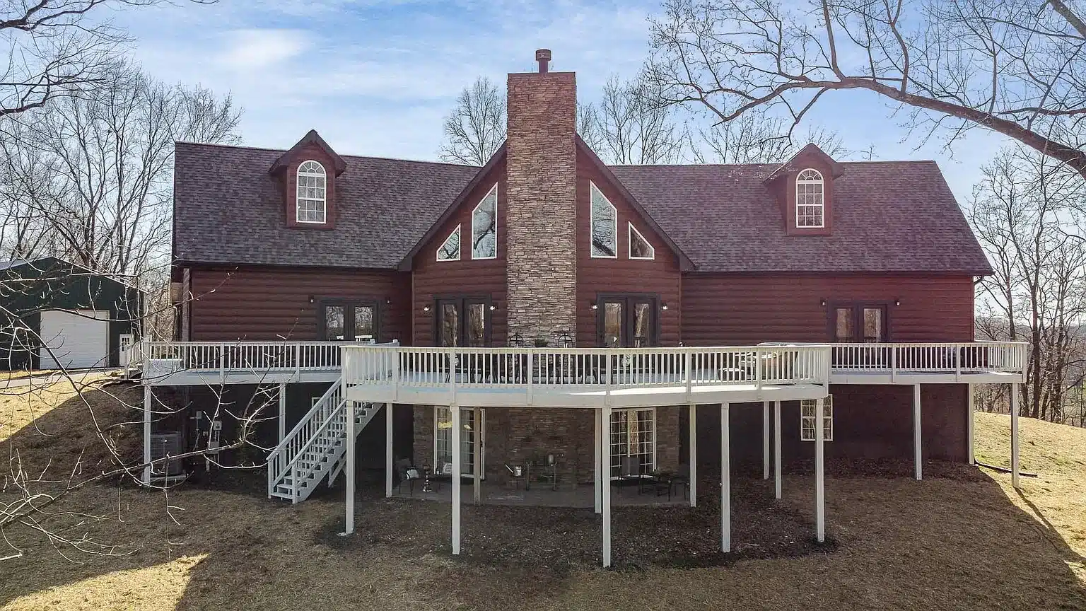 Set on a wooded Tennessee property, this home in Thompson’s Station is finished in Western Cedar log siding that brings out a warm natural glow across the entire exterior. The rich cedar tone pairs with deep brown trim to create a cozy lodge feel that fits beautifully into the surrounding landscape. Large dormers, a full wraparound deck, and a tall stone chimney add architectural depth and help the log siding stand out even more. The back deck spans the entire length of the house, creating a perfect outdoor living space with scenic hilltop views. From the wide front porch to the dramatic rear elevation with floor to ceiling windows, this project shows how log style steel siding can deliver a high end rustic look without the upkeep of real wood.